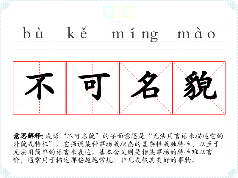 成语“不可名貌”的字面意思是“无法用言语来描述它的外貌或特征”。它强调某种事物或状态的复杂性或独特性,以至于无法用简单的语言来表达。基本含义则是指某事物的特性难以言喻,通常用于描述那些超越常规、非凡或极其美好的事物。