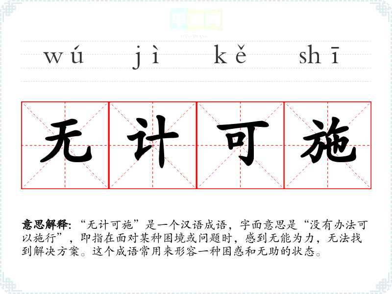 “无计可施”是一个汉语成语,字面意思是“没有办法可以施行”,即指在面对某种困境或问题时,感到无能为力,无法找到解决方案。这个成语常用来形容一种困惑和无助的状态。