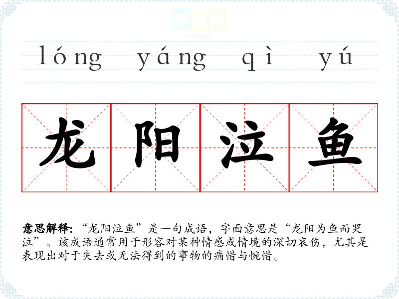“龙阳泣鱼”是一句成语,字面意思是“龙阳为鱼而哭泣”。该成语通常用于形容对某种情感或情境的深切哀伤,尤其是表现出对于失去或无法得到的事物的痛惜与惋惜。
