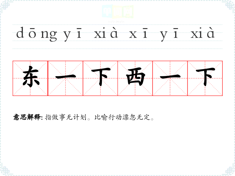 | 东一下西一下 | 指做事无计划。比喻行动漂忽无定。 |