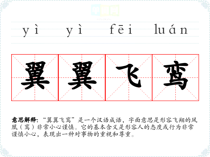在传统文化中,谨慎被视为一种美德,尤其是在处理人际关系和重大决策时。“翼翼飞鸾”反映了古代文人对细致入微的追求,而在现代社会,尤其是在商业和职场中,谨慎依然是成功的重要因素。因此,该成语在现代仍然具有很强的适用性。