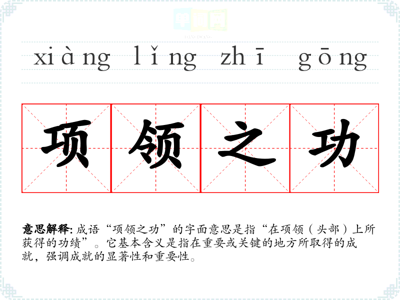 成语“项领之功”的字面意思是指“在项领(头部)上所获得的功绩”。它基本含义是指在重要或关键的地方所取得的成就,强调成就的显著性和重要性。
