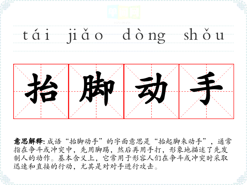 成语“抬脚动手”的字面意思是“抬起脚来动手”,通常指在争斗或冲突中,先用脚踢,然后再用手打,形象地描述了先发制人的动作。基本含义上,它常用于形容人们在争斗或冲突时采取迅速和直接的行动,尤其是对对手进行攻击。