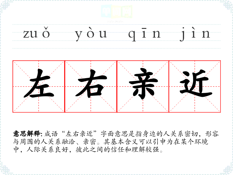 成语“左右亲近”字面意思是指身边的人关系密切,形容与周围的人关系融洽、亲密。其基本含义可以引申为在某个环境中,人际关系良好,彼此之间的信任和理解较强。