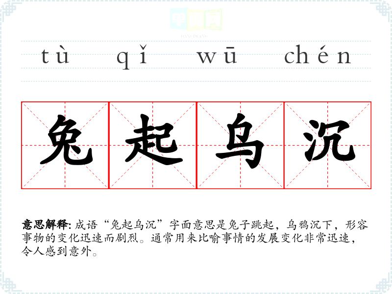 成语“兔起乌沉”字面意思是兔子跳起,乌鸦沉下,形容事物的变化迅速而剧烈。通常用来比喻事情的发展变化非常迅速,令人感到意外。