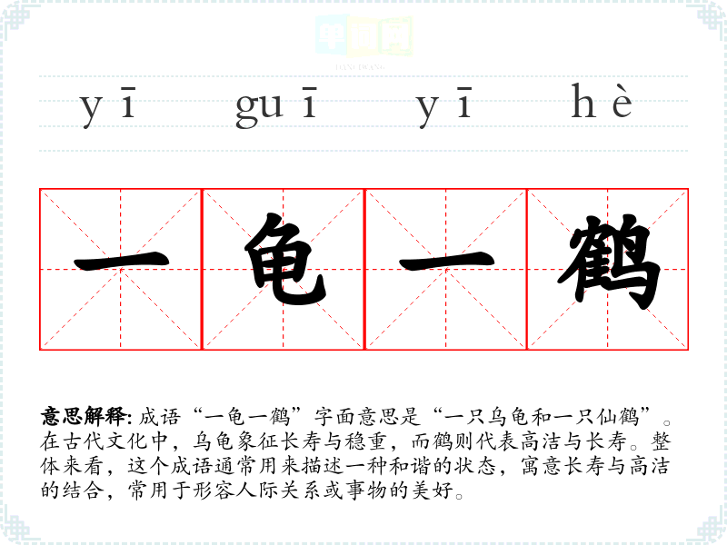 成语“一龟一鹤”字面意思是“一只乌龟和一只仙鹤”。在古代文化中,乌龟象征长寿与稳重,而鹤则代表高洁与长寿。整体来看,这个成语通常用来描述一种和谐的状态,寓意长寿与高洁的结合,常用于形容人际关系或事物的美好。