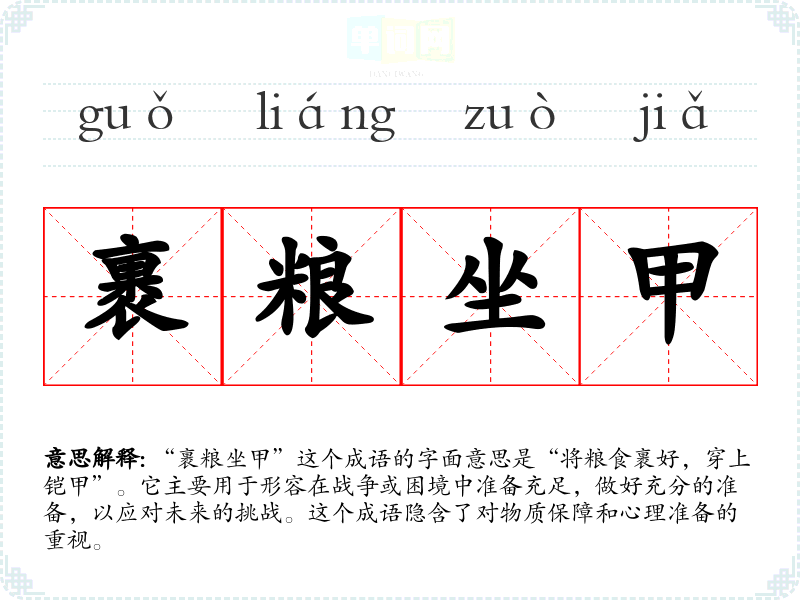 “裹粮坐甲”这个成语的字面意思是“将粮食裹好,穿上铠甲”。它主要用于形容在战争或困境中准备充足,做好充分的准备,以应对未来的挑战。这个成语隐含了对物质保障和心理准备的重视。