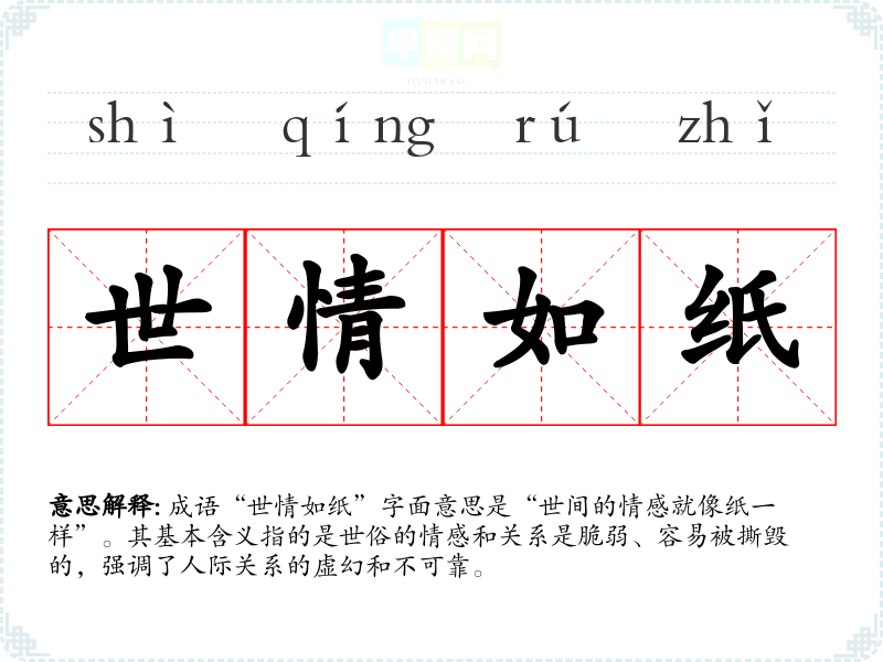 成语“世情如纸”字面意思是“世间的情感就像纸一样”。其基本含义指的是世俗的情感和关系是脆弱、容易被撕毁的,强调了人际关系的虚幻和不可靠。
