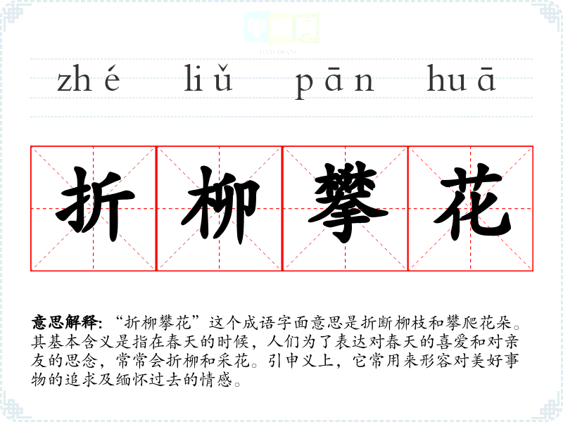 “折柳攀花”这个成语字面意思是折断柳枝和攀爬花朵。其基本含义是指在春天的时候,人们为了表达对春天的喜爱和对亲友的思念,常常会折柳和采花。引申义上,它常用来形容对美好事物的追求及缅怀过去的情感。