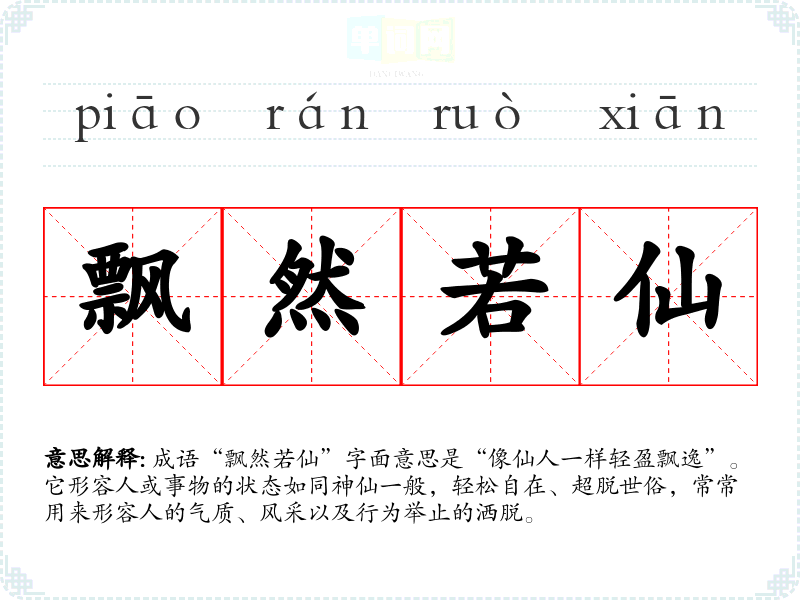 成语“飘然若仙”字面意思是“像仙人一样轻盈飘逸”。它形容人或事物的状态如同神仙一般,轻松自在、超脱世俗,常常用来形容人的气质、风采以及行为举止的洒脱。
