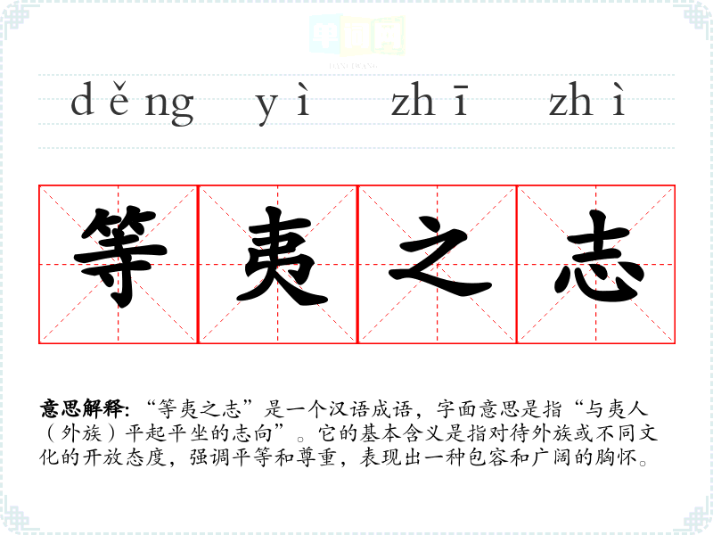 “等夷之志”是一个汉语成语,字面意思是指“与夷人(外族)平起平坐的志向”。它的基本含义是指对待外族或不同文化的开放态度,强调平等和尊重,表现出一种包容和广阔的胸怀。