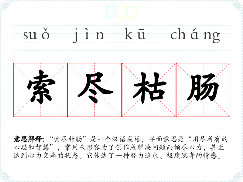 “索尽枯肠”是一个汉语成语,字面意思是“用尽所有的心思和智慧”,常用来形容为了创作或解决问题而倾尽心力,甚至达到心力交瘁的状态。它传达了一种努力追求、极度思考的情感。