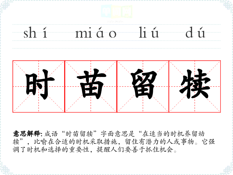 成语“时苗留犊”字面意思是“在适当的时机养留幼犊”,比喻在合适的时机采取措施,留住有潜力的人或事物。它强调了时机和选择的重要性,提醒人们要善于抓住机会。