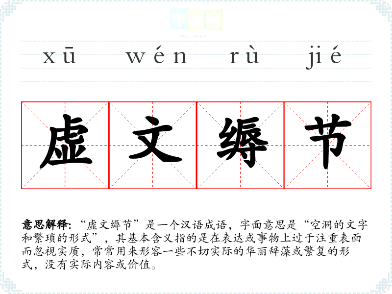 “虚文缛节”是一个汉语成语,字面意思是“空洞的文字和繁琐的形式”,其基本含义指的是在表达或事物上过于注重表面而忽视实质,常常用来形容一些不切实际的华丽辞藻或繁复的形式,没有实际内容或价值。