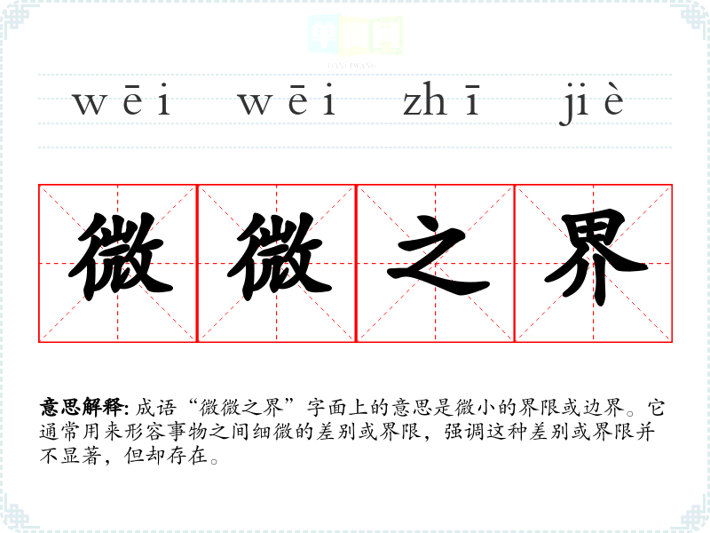 成语“微微之界”字面上的意思是微小的界限或边界。它通常用来形容事物之间细微的差别或界限,强调这种差别或界限并不显著,但却存在。