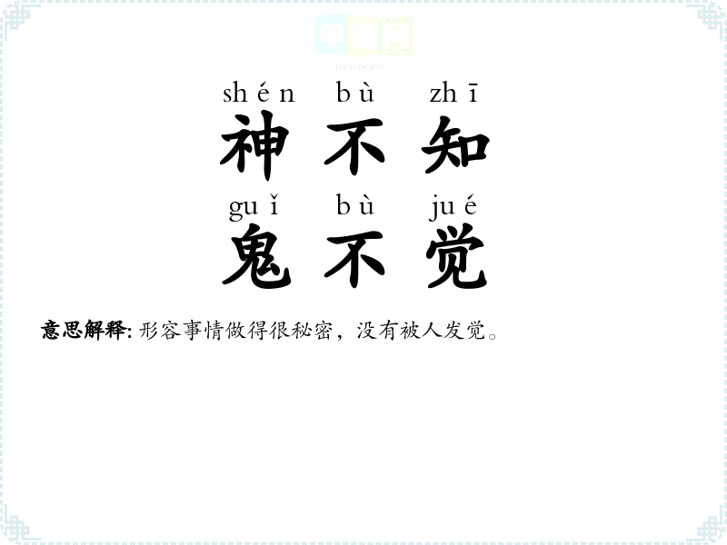 | 神不知,鬼不觉 | 形容事情做得很秘密,没有被人发觉。 |