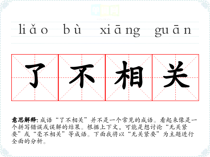成语“了不相关”并不是一个常见的成语。看起来像是一个拼写错误或误解的结果。根据上下文,可能是想讨论“无关紧要”或“毫不相关”等成语。下面我将以“无关紧要”为主题进行全面的分析。