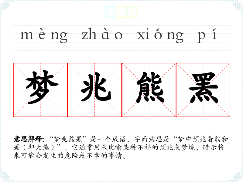 “梦兆熊罴”是一个成语,字面意思是“梦中预兆着熊和罴(即大熊)”。它通常用来比喻某种不祥的预兆或梦境,暗示将来可能会发生的危险或不幸的事情。