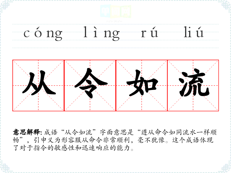 成语“从令如流”字面意思是“遵从命令如同流水一样顺畅”,引申义为形容服从命令非常顺利,毫不犹豫。这个成语体现了对于指令的敏感性和迅速响应的能力。