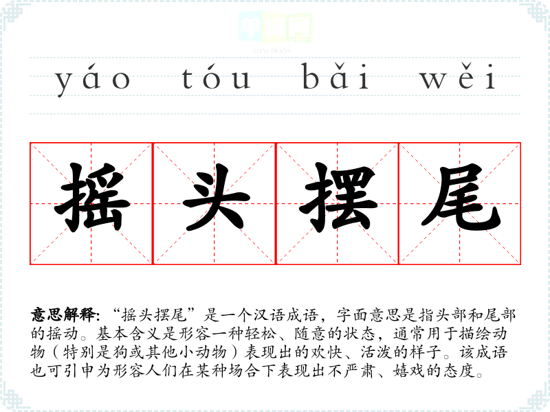 “摇头摆尾”是一个汉语成语,字面意思是指头部和尾部的摇动。基本含义是形容一种轻松、随意的状态,通常用于描绘动物(特别是狗或其他小动物)表现出的欢快、活泼的样子。该成语也可引申为形容人们在某种场合下表现出不严肃、嬉戏的态度。