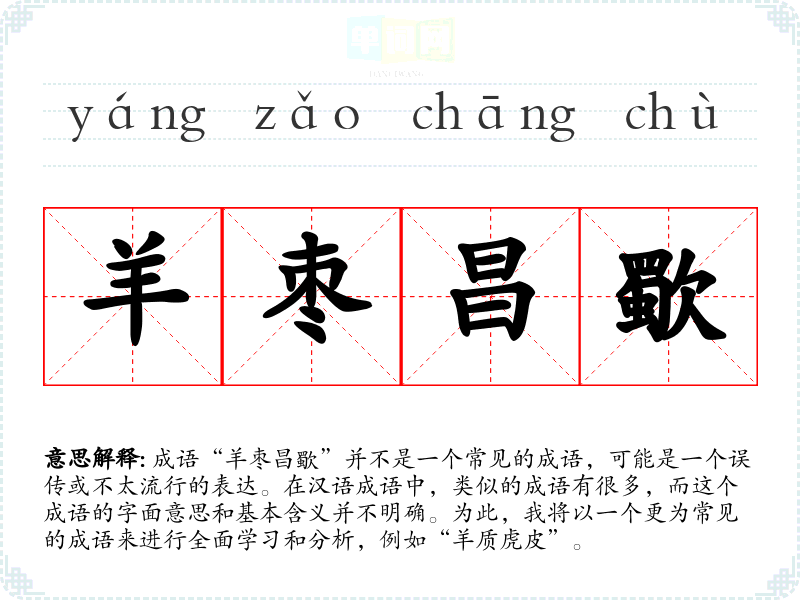 成语“羊枣昌歜”并不是一个常见的成语,可能是一个误传或不太流行的表达。在汉语成语中,类似的成语有很多,而这个成语的字面意思和基本含义并不明确。为此,我将以一个更为常见的成语来进行全面学*和分析,例如“羊质虎皮”。
