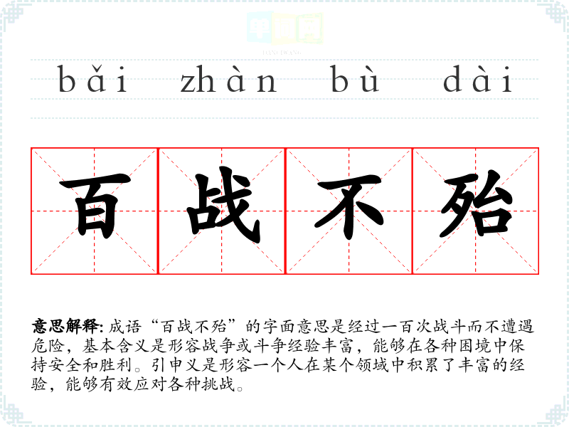 成语“百战不殆”的字面意思是经过一百次战斗而不遭遇危险,基本含义是形容战争或斗争经验丰富,能够在各种困境中保持安全和胜利。引申义是形容一个人在某个领域中积累了丰富的经验,能够有效应对各种挑战。