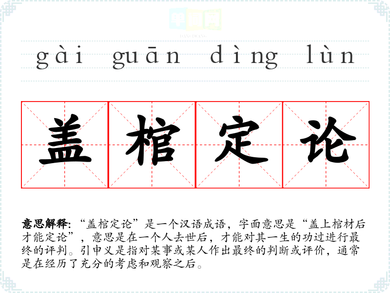 | 盖棺论定 | 论定:下结论。盖上棺材盖,才能下结论。人死后对其一生作出评价。 |