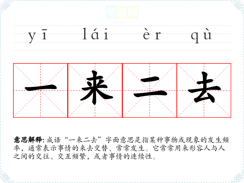 成语“一来二去”字面意思是指某种事物或现象的发生频率,通常表示事情的来去交替、常常发生。它常常用来形容人与人之间的交往、交互频繁,或者事情的连续性。