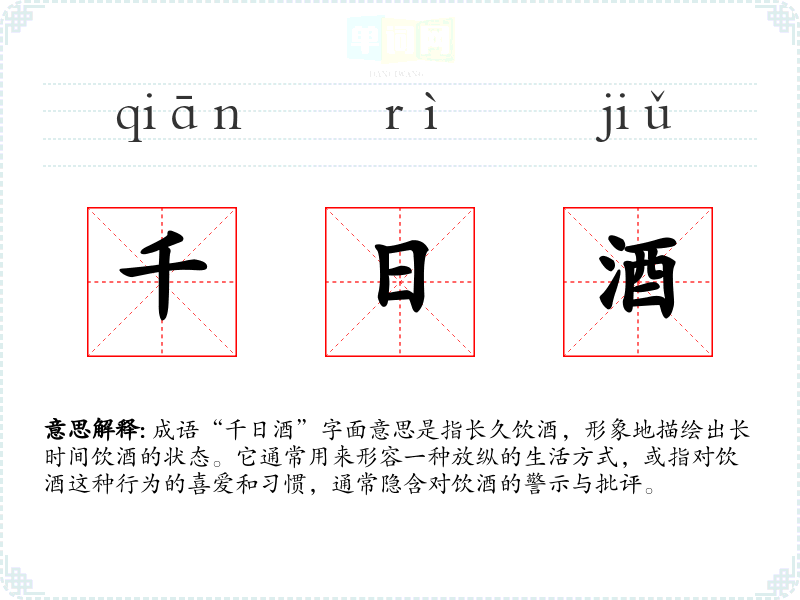 - 文学作品:用于描写人物的放纵生活,例如在古代诗词中,诗人可能会以“千日酒”来表现对饮酒的热爱与无奈。