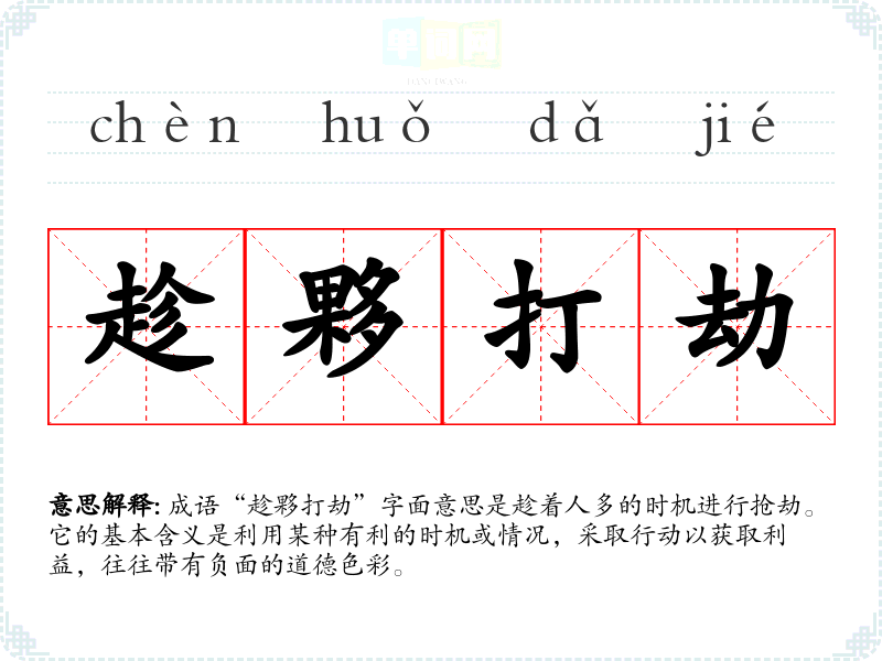 成语“趁夥打劫”字面意思是趁着人多的时机进行抢劫。它的基本含义是利用某种有利的时机或情况,采取行动以获取利益,往往带有负面的道德色彩。