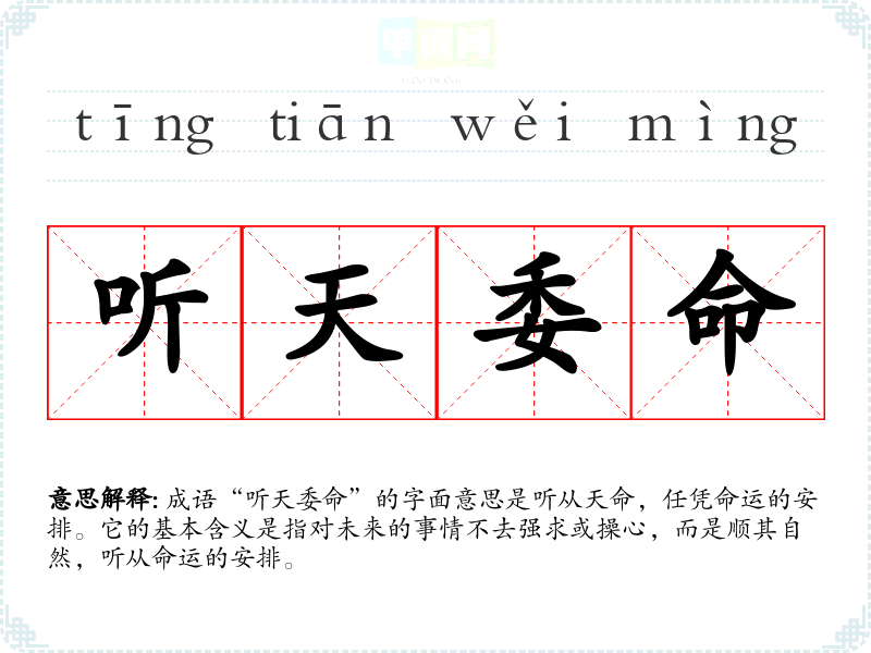 通过对“听天委命”的学,我认识到在生活中,适时放下对某些事情的执着,可以带来更大的内心平和。这不仅是语言学的一部分,也是对生活哲学的一种体悟,更能帮助我在表达时,传达出一种豁达和宽容的态度。