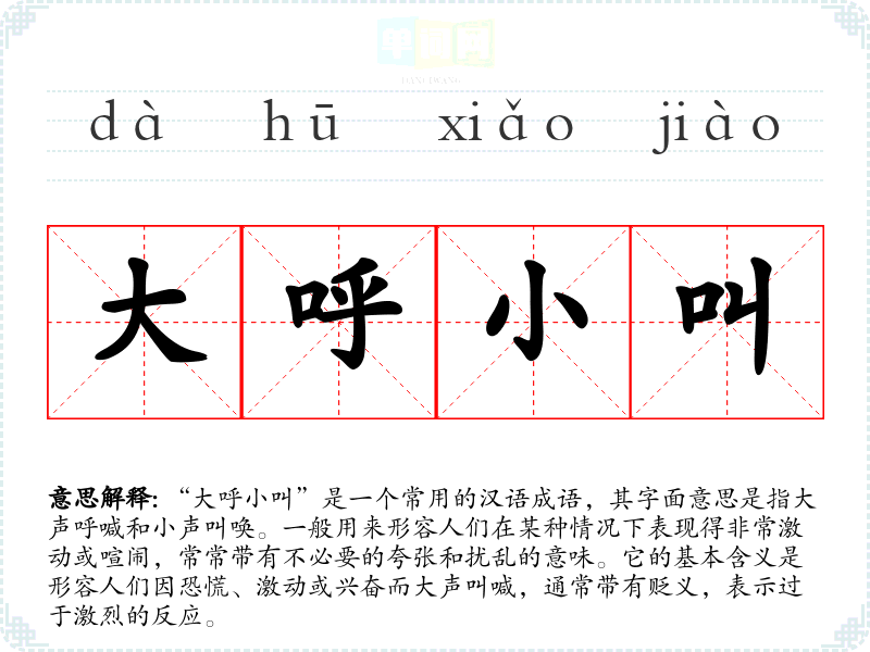 “大呼小叫”是一个常用的汉语成语,其字面意思是指大声呼喊和小声叫唤。一般用来形容人们在某种情况下表现得非常激动或喧闹,常常带有不必要的夸张和扰乱的意味。它的基本含义是形容人们因恐慌、激动或兴奋而大声叫喊,通常带有贬义,表示过于激烈的反应。