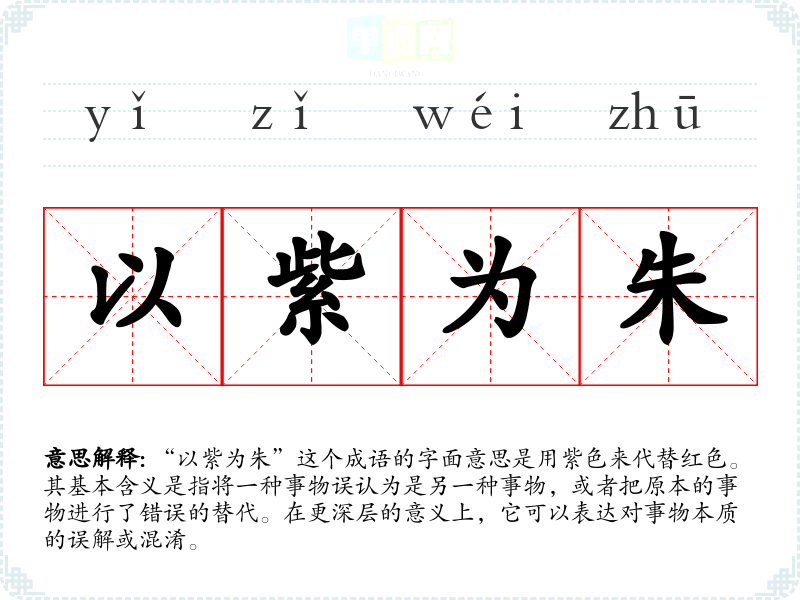 “以紫为朱”这个成语的字面意思是用紫色来代替红色。其基本含义是指将一种事物误认为是另一种事物,或者把原本的事物进行了错误的替代。在更深层的意义上,它可以表达对事物本质的误解或混淆。