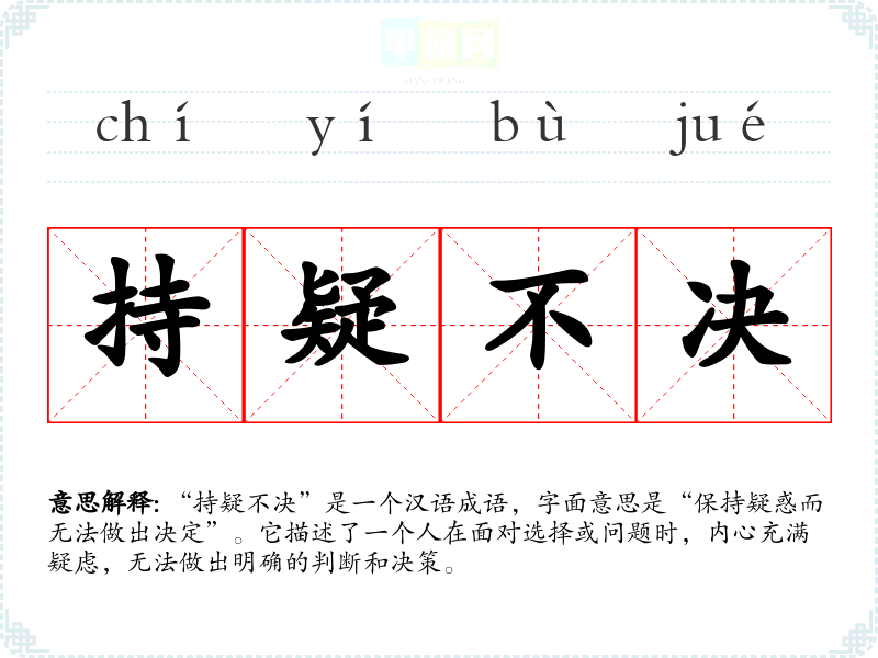 “持疑不决”是一个汉语成语,字面意思是“保持疑惑而无法做出决定”。它描述了一个人在面对选择或问题时,内心充满疑虑,无法做出明确的判断和决策。