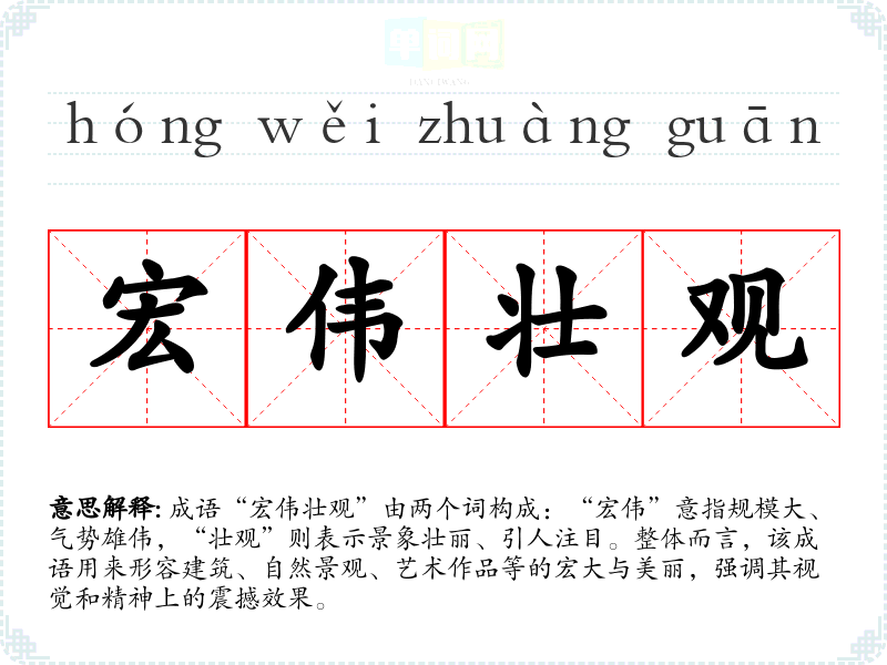 成语“宏伟壮观”由两个词构成:“宏伟”意指规模大、气势雄伟,“壮观”则表示景象壮丽、引人注目。整体而言,该成语用来形容建筑、自然景观、艺术作品等的宏大与美丽,强调其视觉和精神上的震撼效果。