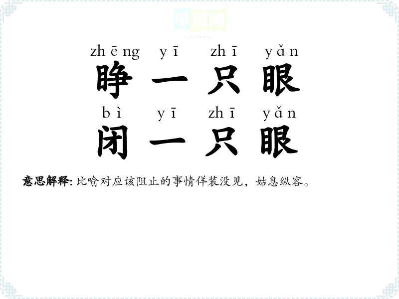 | 睁一只眼,闭一只眼 | 比喻对应该阻止的事情佯装没见,姑息纵容。 |