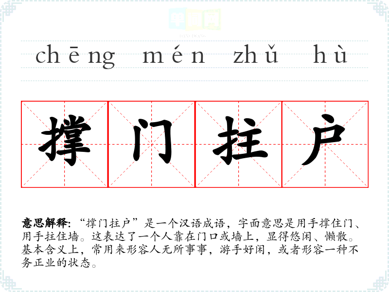 “撑门拄户”是一个汉语成语,字面意思是用手撑住门、用手拄住墙。这表达了一个人靠在门口或墙上,显得悠闲、懒散。基本含义上,常用来形容人无所事事,游手好闲,或者形容一种不务正业的状态。
