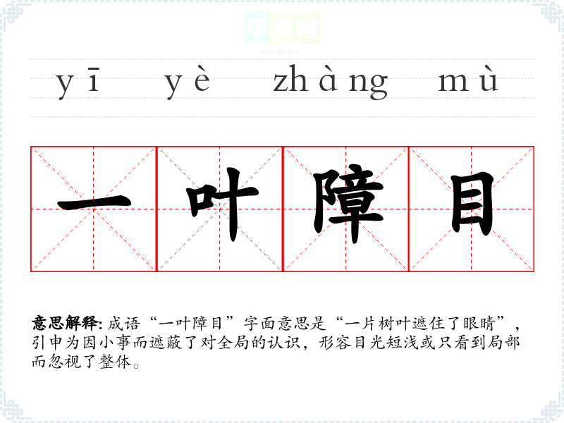 成语“一叶障目”字面意思是“一片树叶遮住了眼睛”,引申为因小事而遮蔽了对全局的认识,形容目光短浅或只看到局部而忽视了整体。