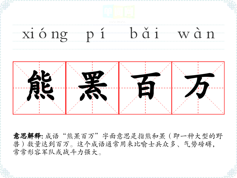 成语“熊罴百万”字面意思是指熊和罴(即一种大型的野兽)数量达到百万。这个成语通常用来比喻士兵众多、气势磅礴,常常形容军队或战斗力强大。
