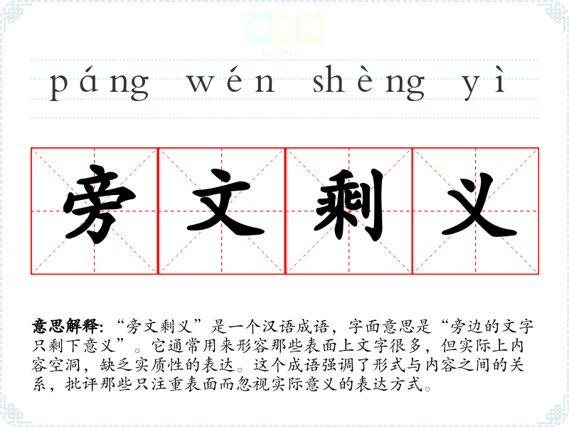 “旁文剩义”并没有明确的历史典故或特定的文学出处,但其构成中的“旁文”可以理解为旁边的文字或附加的文字,而“剩义”则强调剩余的意义。该成语强调了在写作或表达中,往往存在表面华丽但实质内容欠缺的现象,反映了对文字表达的深刻思考。