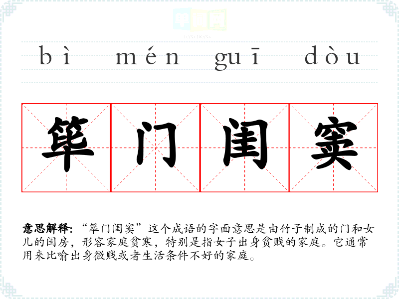 “筚门闺窦”这个成语的字面意思是由竹子制成的门和女儿的闺房,形容家庭贫寒,特别是指女子出身贫贱的家庭。它通常用来比喻出身微贱或者生活条件不好的家庭。