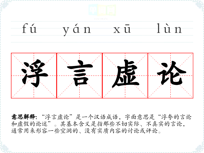 “浮言虚论”是一个汉语成语,字面意思是“浮夸的言论和虚假的论述”。其基本含义是指那些不切实际、不真实的言论,通常用来形容一些空洞的、没有实质内容的讨论或评论。