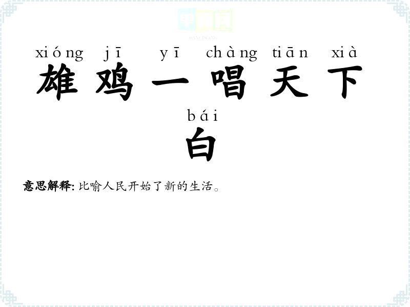 | 一唱雄鸡天下白 | 公鸡一叫,天就亮了。形容东方破晓,长夜宣告结束。指真相大白 |
