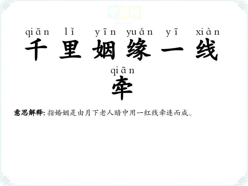 | 千里姻缘一线牵 | 指婚姻是由月下老人暗中用一红线牵连而成。 |