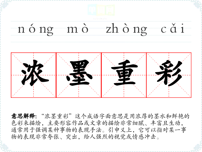 “浓墨重彩”这个成语字面意思是用浓厚的墨水和鲜艳的色彩来描绘,主要形容作品或文章的描绘非常细腻、丰富且生动,通常用于强调某种事物的表现手法。引申义上,它可以指对某一事物的表现非常夸张、突出,给人强烈的视觉或情感冲击。
