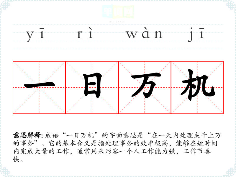 成语“一日万机”的字面意思是“在一天内处理成千上万的事务”。它的基本含义是指处理事务的效率极高,能够在短时间内完成大量的工作,通常用来形容一个人工作能力强,工作节奏快。