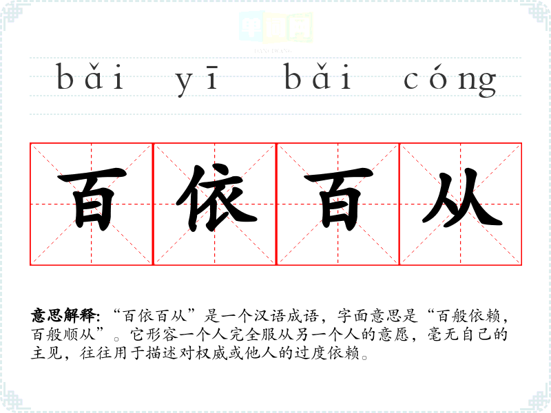 “百依百从”是一个汉语成语,字面意思是“百般依赖,百般顺从”。它形容一个人完全服从另一个人的意愿,毫无自己的主见,往往用于描述对权威或他人的过度依赖。