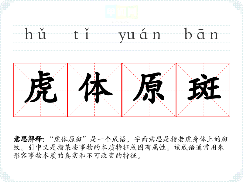 “虎体原斑”出自《左传》,原文提到**的斑纹象征着其固有的本性,强调了本质的不可改变性。这个成语的用法则在后来的文学作品中逐渐演变,成为用来比喻事物的根本特征或不可逆转的属性。