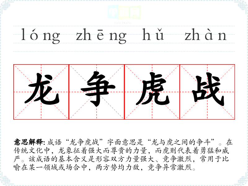 在**传统文化中,龙和虎分别象征着权力与勇气,成语“龙争虎战”在许多文化场合中都能引发共鸣,特别是在描绘竞争、战争或英雄主义时。在现代社会中,尤其在商业竞争和体育竞技中,这个成语依然适用,体现了竞争的激烈和不可预测性。