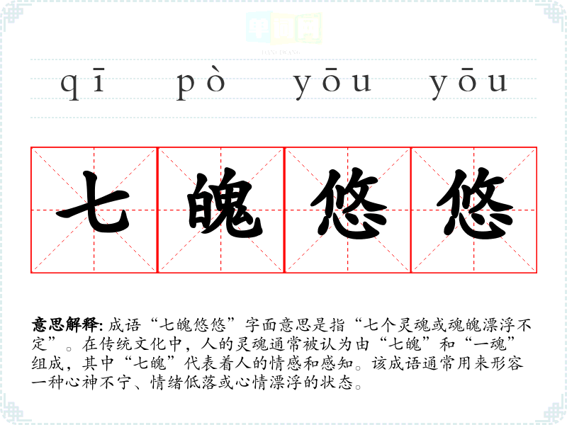 “七魄”源自古代的灵魂观念,尤其是在道教和文化中。它们分别对应着人的不同情感和性格特征。成语“七魄悠悠”可能出现在古代文人墨客的诗作中,用以描绘内心的迷惘与不安,具体的文学出处可能较为模糊,但其内涵与古代哲学思想密切相关。
